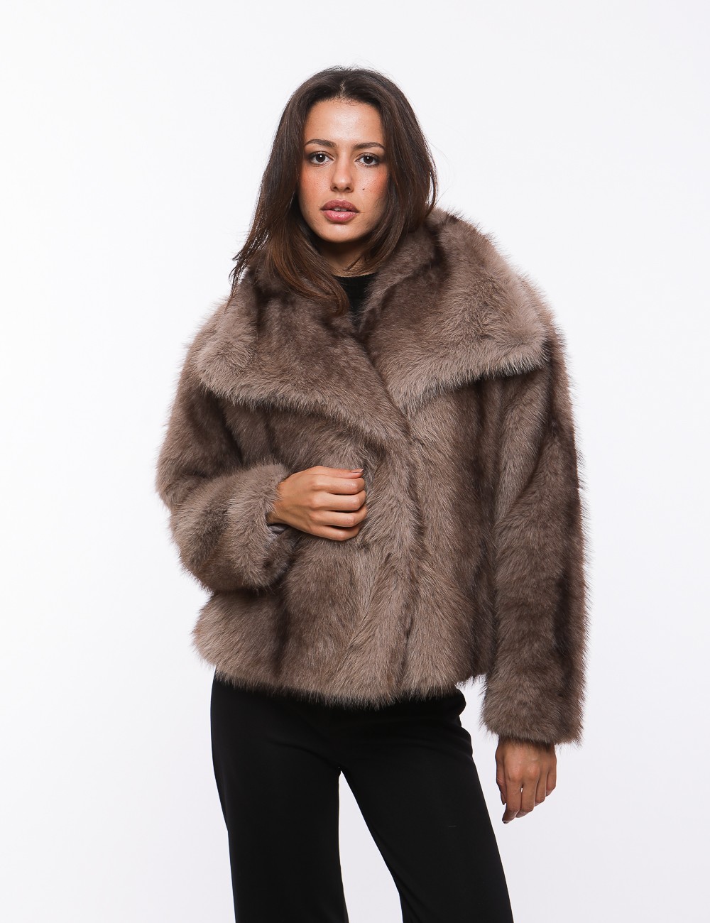 Veste courte en fourrure sublimée par un col oversize en fourrure ton sur ton. Sa coupe structurée et ses finitions dorées lui confèrent une allure élégante et sophistiquée.
