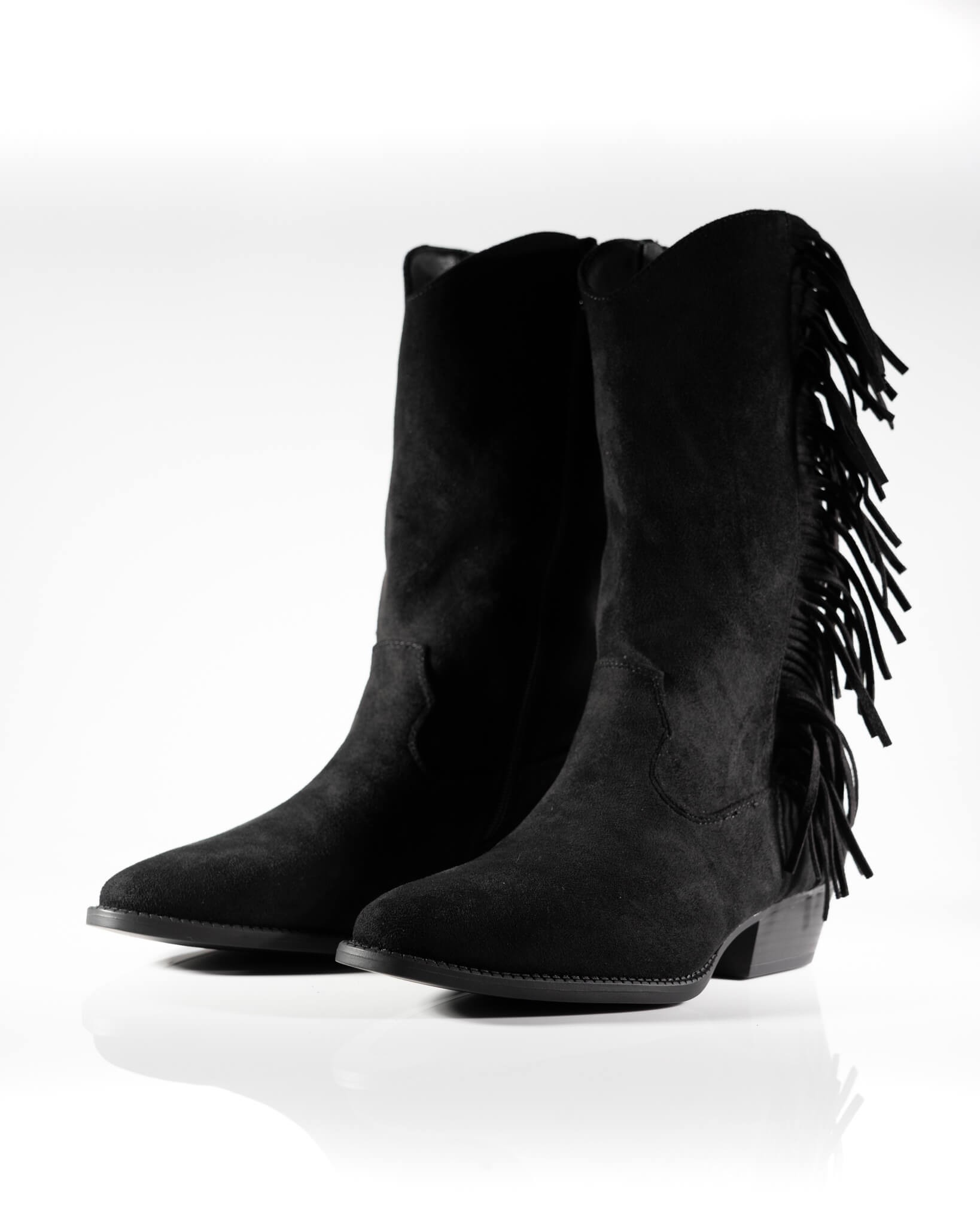 Ajoutez une touche de caractère à votre garde-robe avec nos bottes style western en suédine. Ornées de franges fluides sur le côté et dotées d'un bout pointu élégant, elles allient confort et style audacieux. Parfaites pour sublimer une robe fluide ou un jean slim. Disponible en Noir intemporel et en Camel authentique.